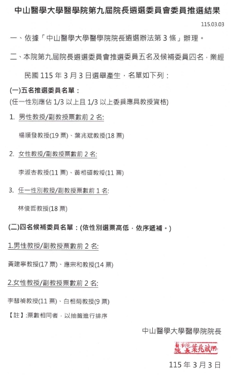醫學院第九屆院長遴選委員會委員推選結果公告